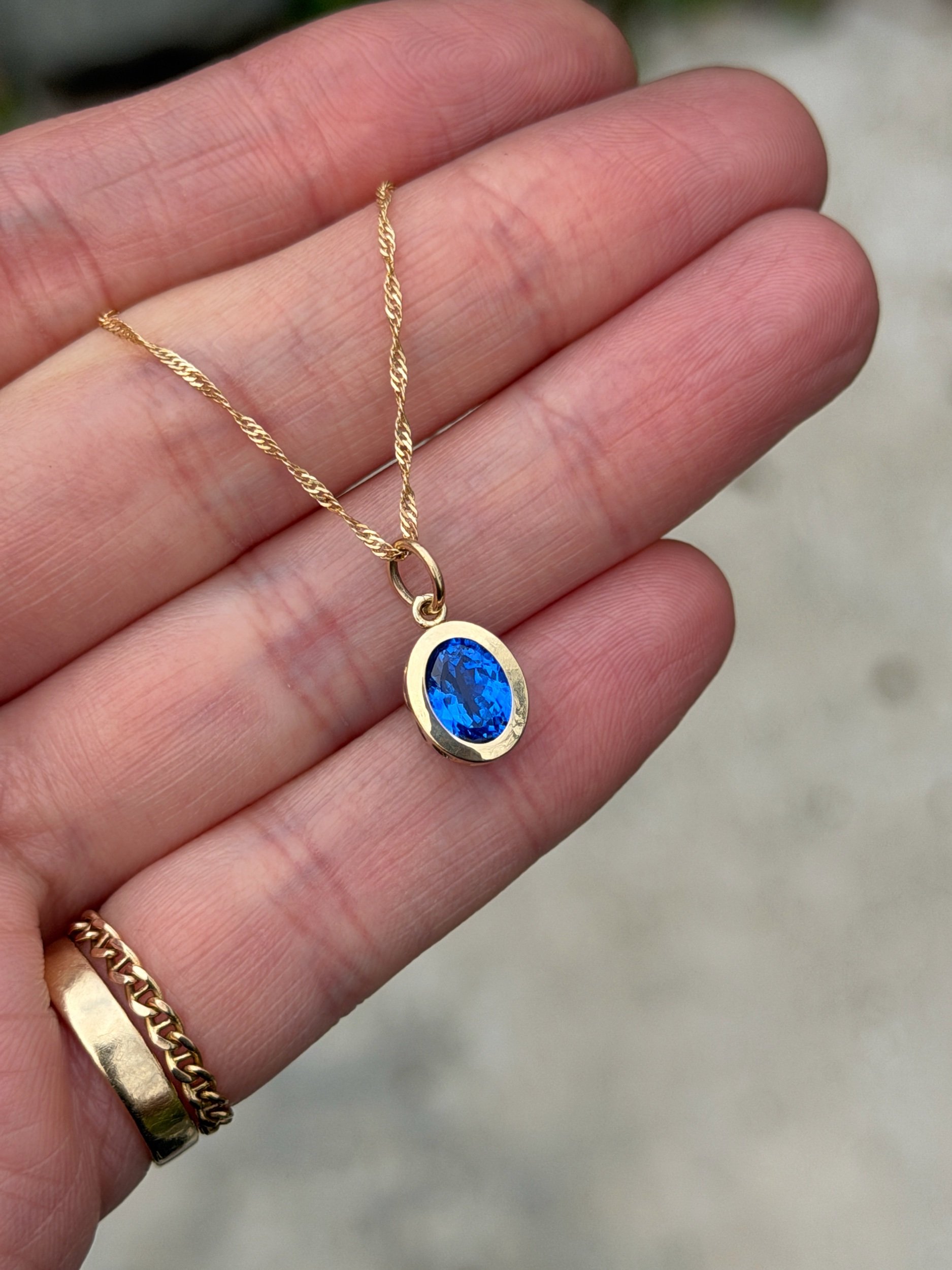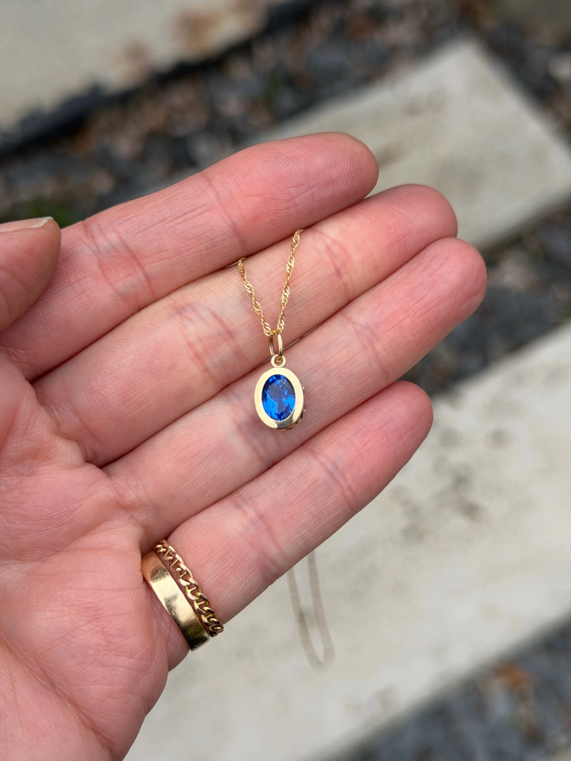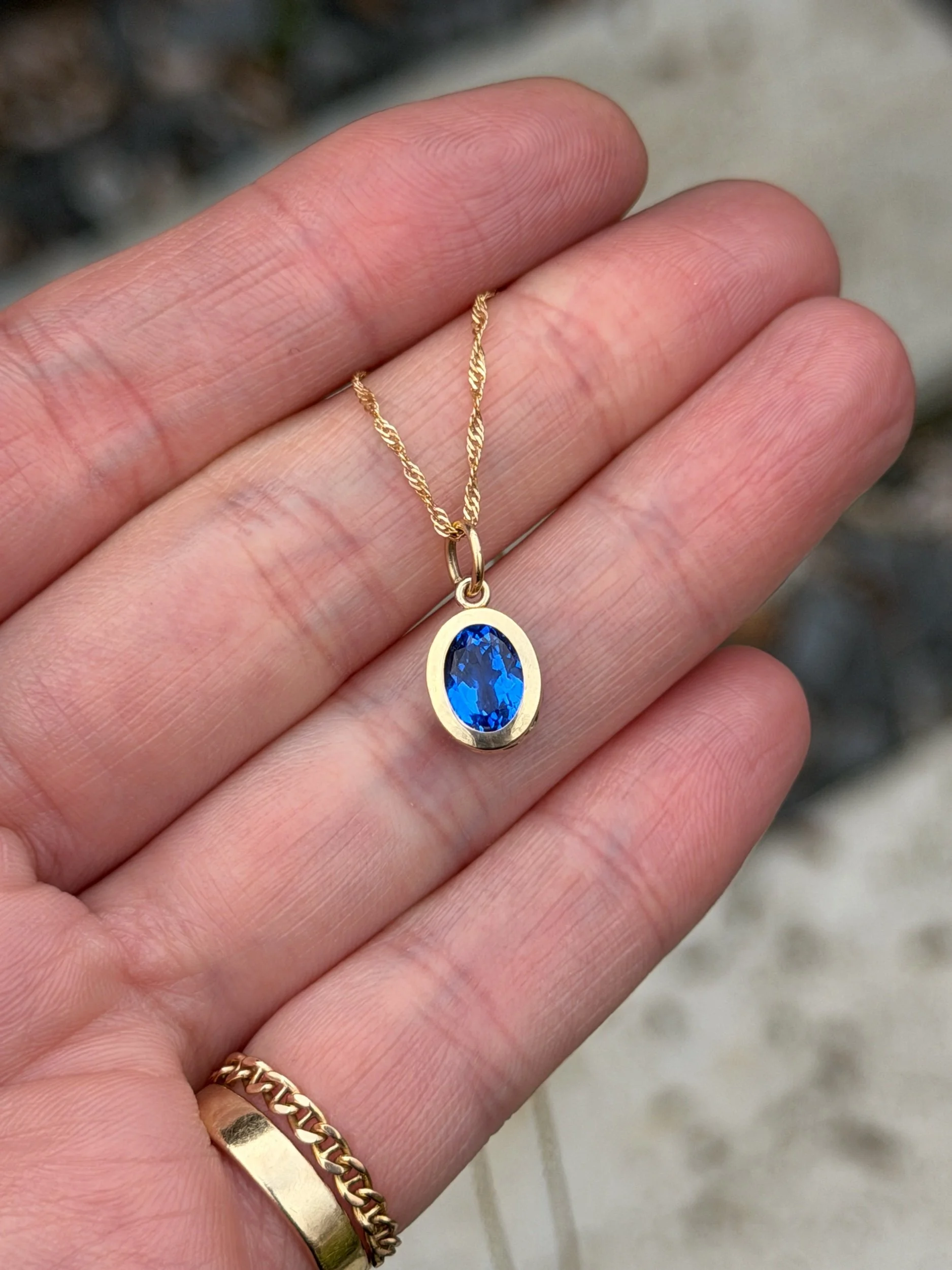 A cornflower blue lab spinel wrapped in 14k solid yellow gold. Inspired by fields of blue May flowers. Ships within two business days.