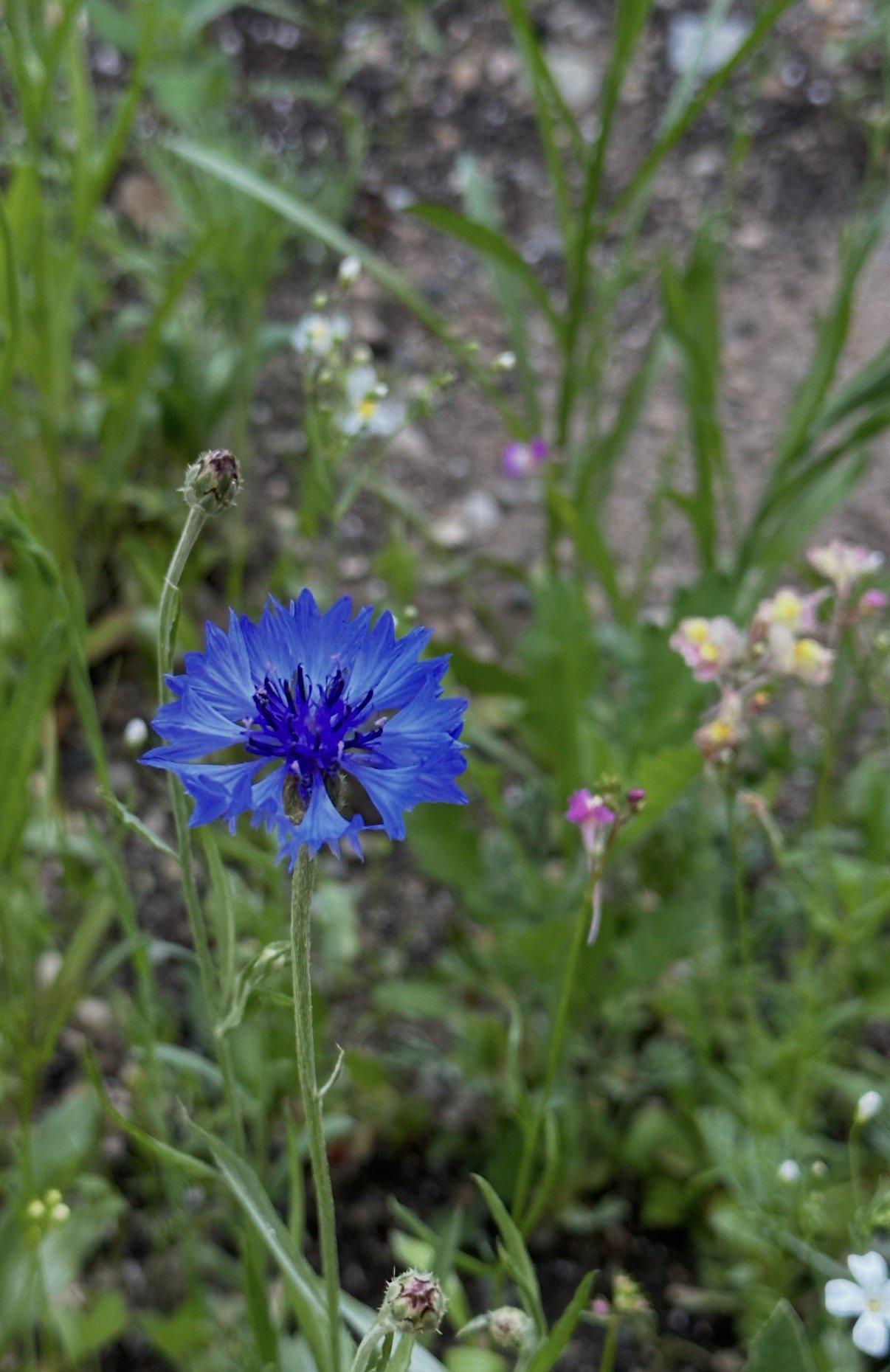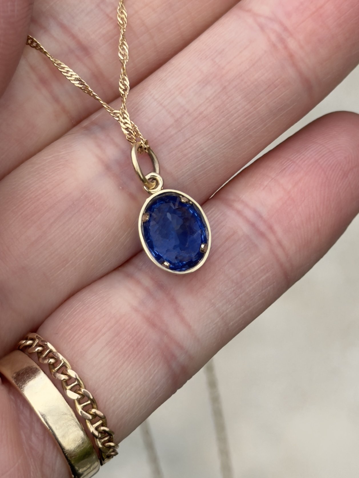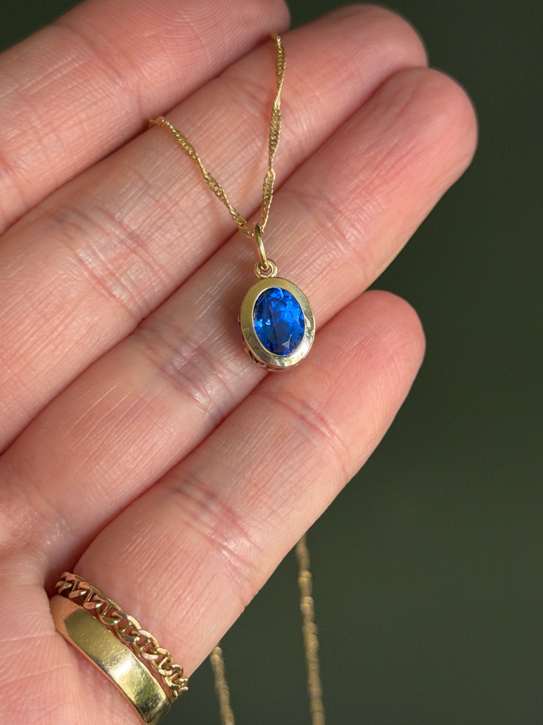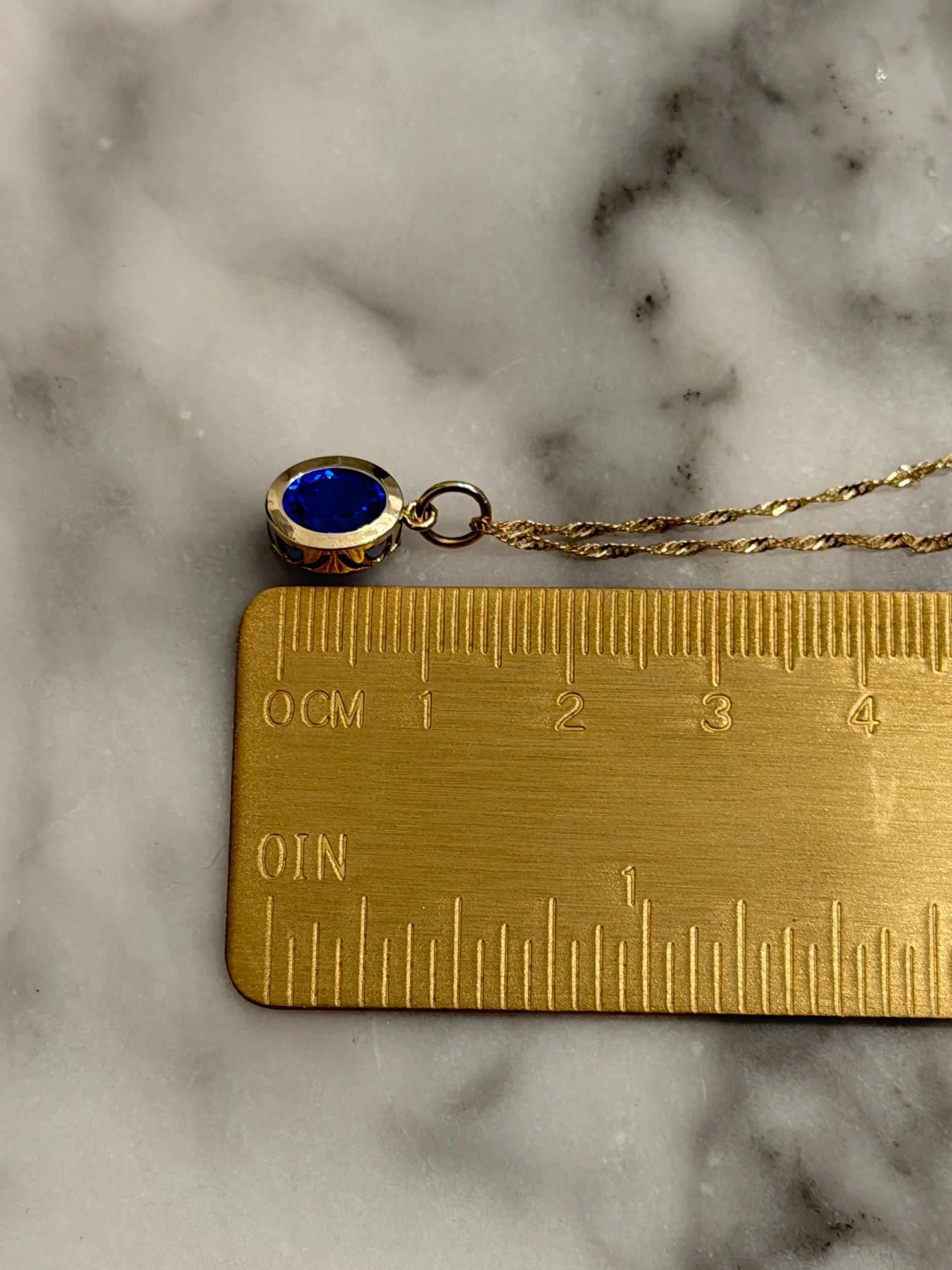 A cornflower blue lab spinel wrapped in 14k solid yellow gold. Inspired by fields of blue May flowers. Ships within two business days.