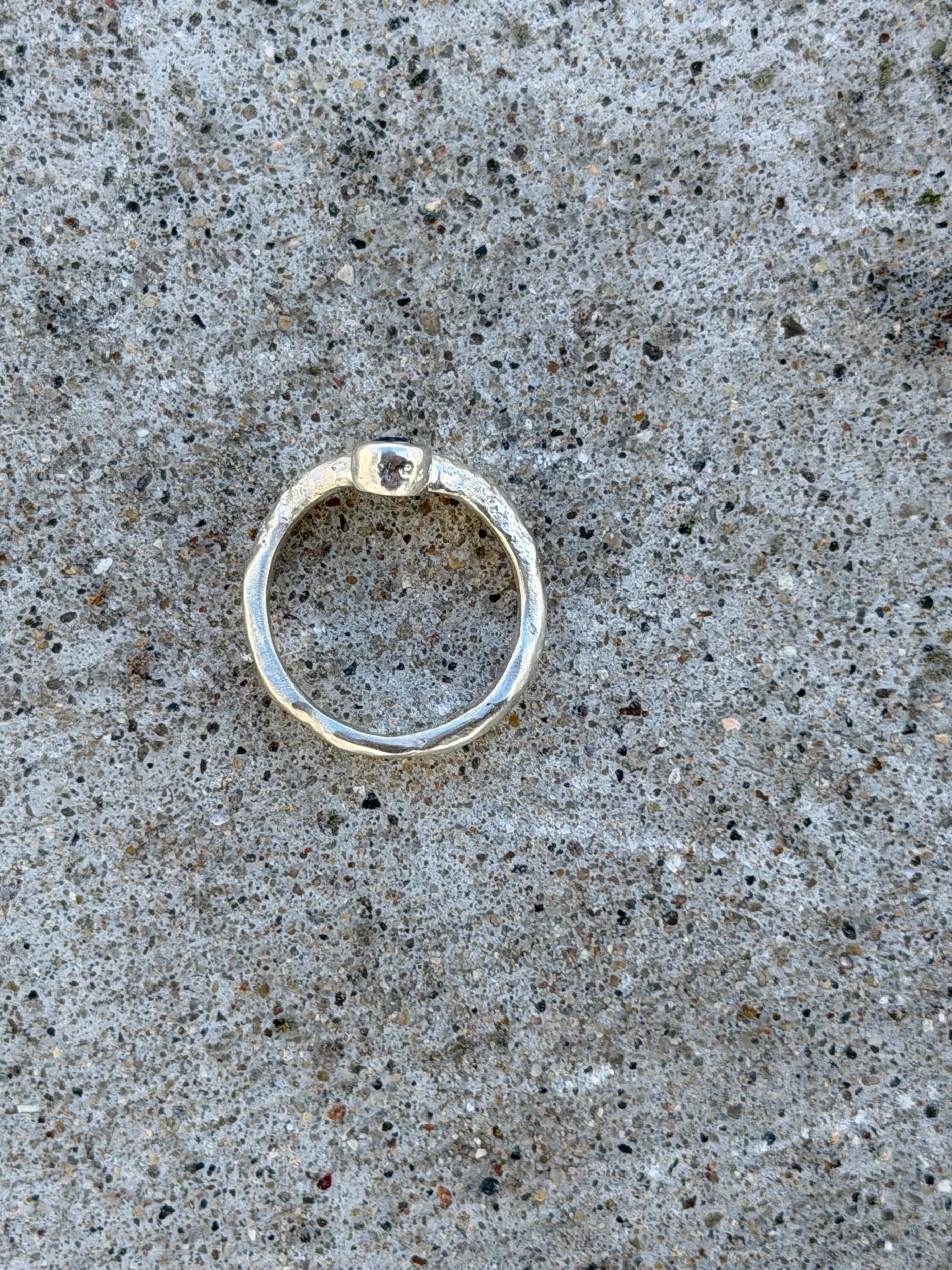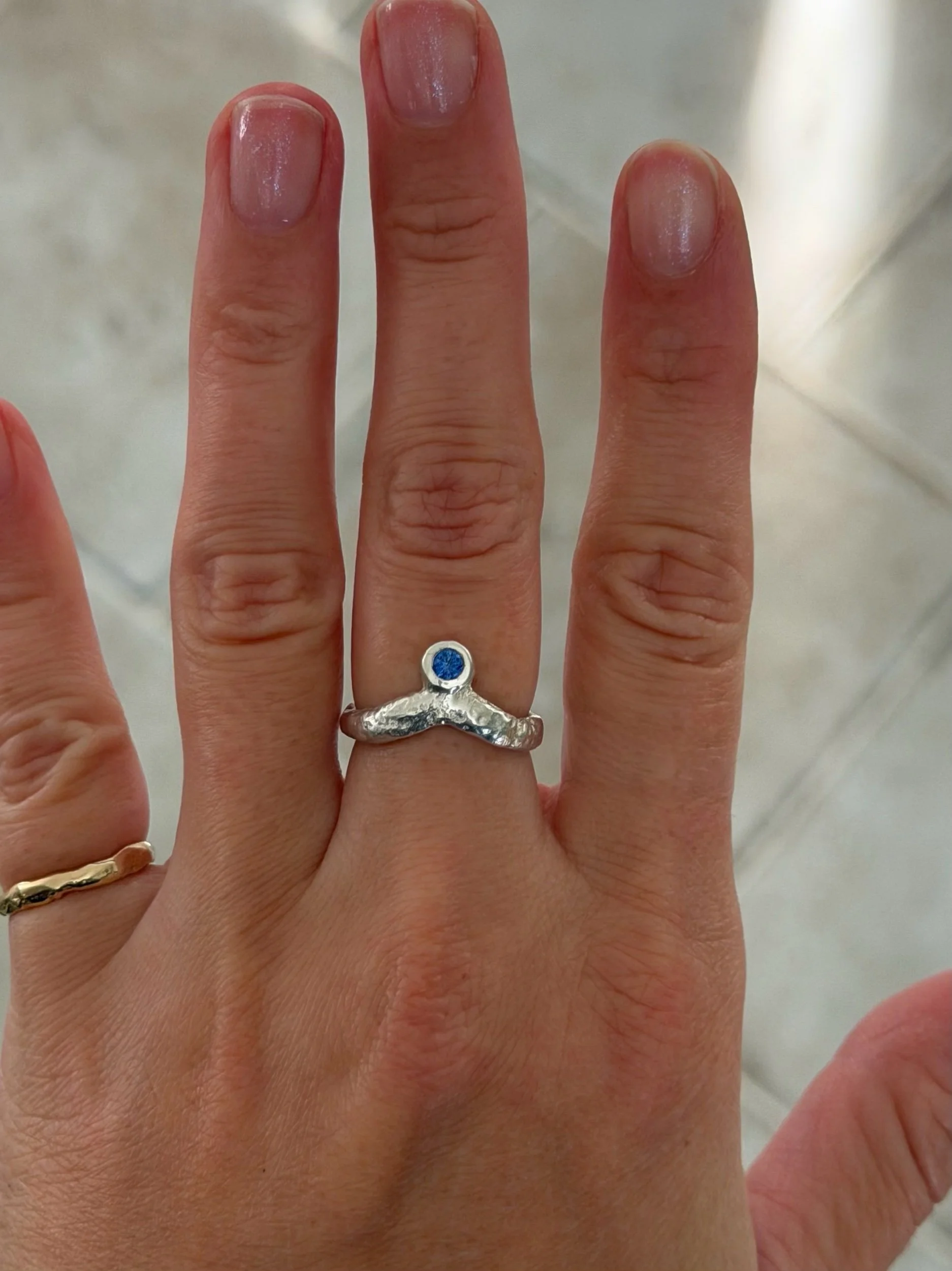 Argentium silver and a lab Ceylon blue sapphire, inspired by the sea’s textured shoreline and it’s blue magic. Sandcasted in-house, one of a kind. Size 6, ready to ship within two business days.