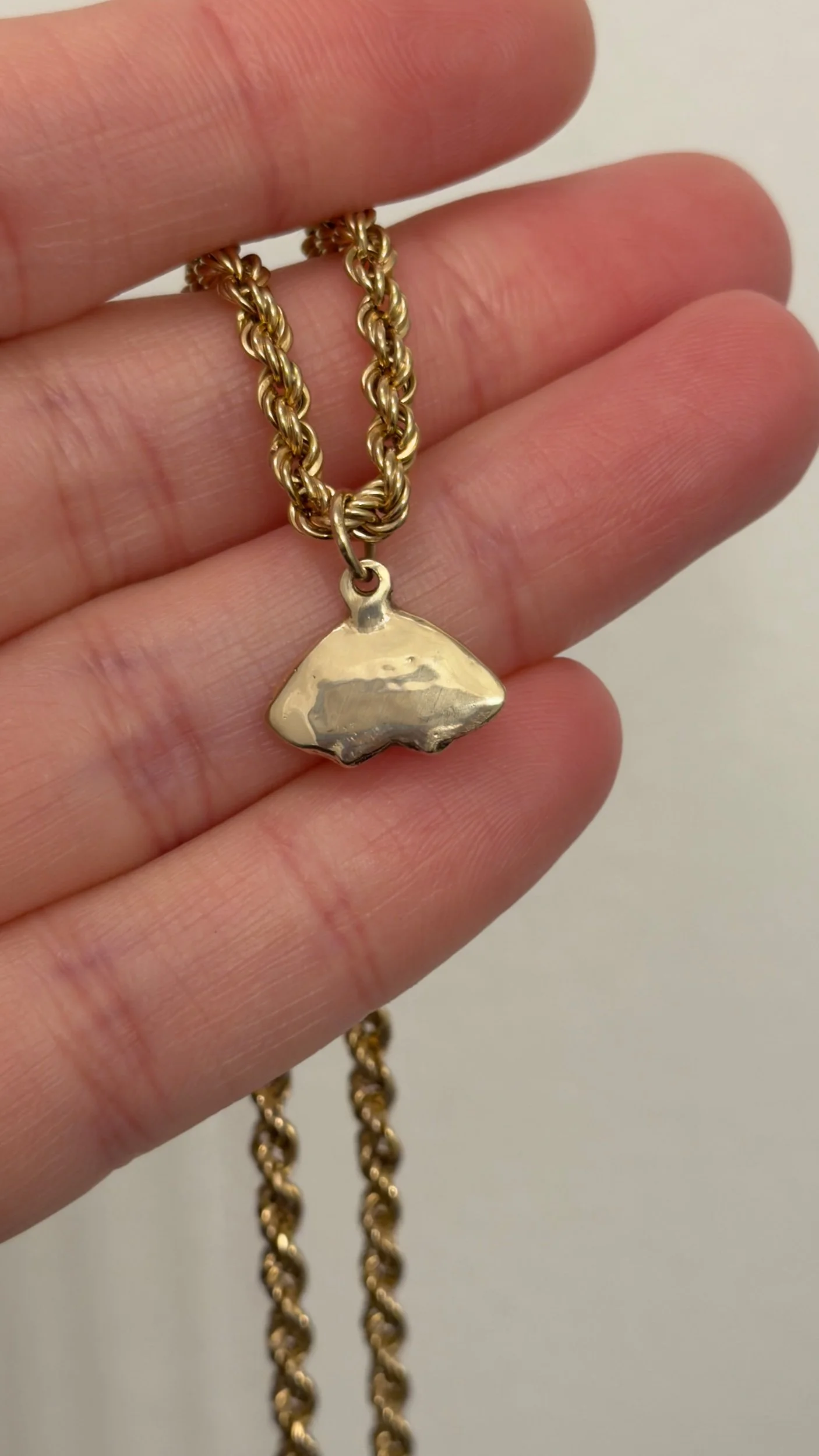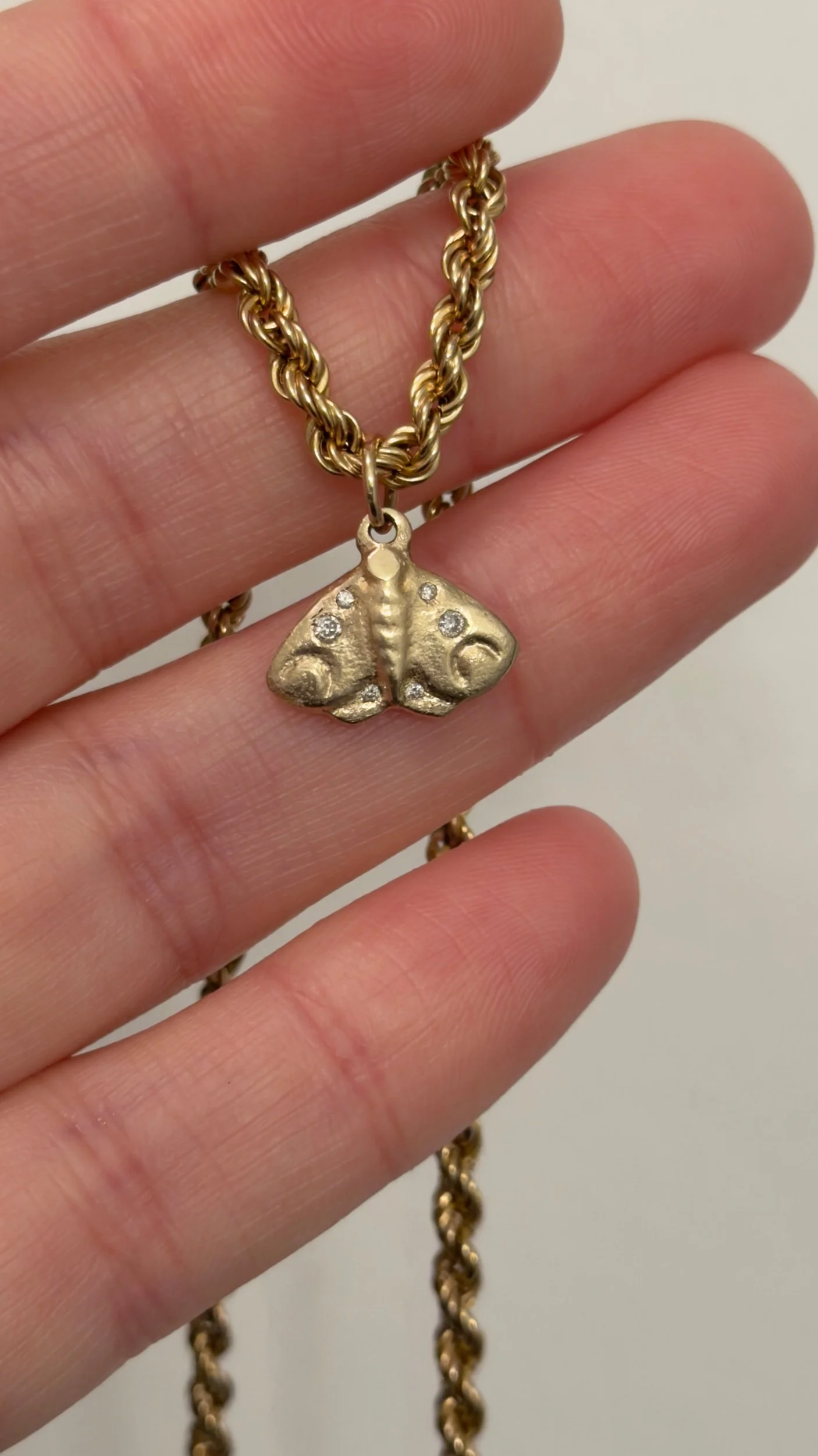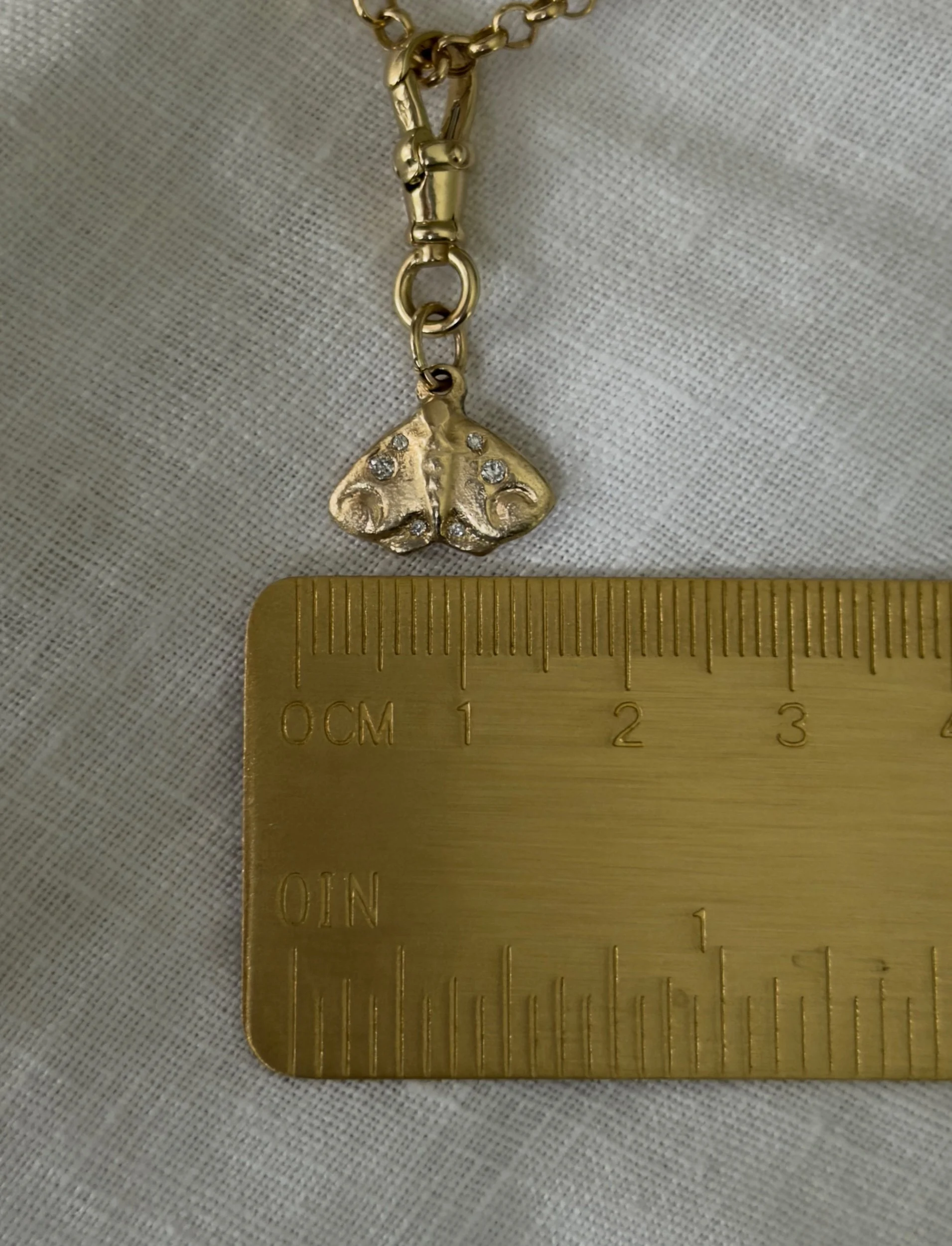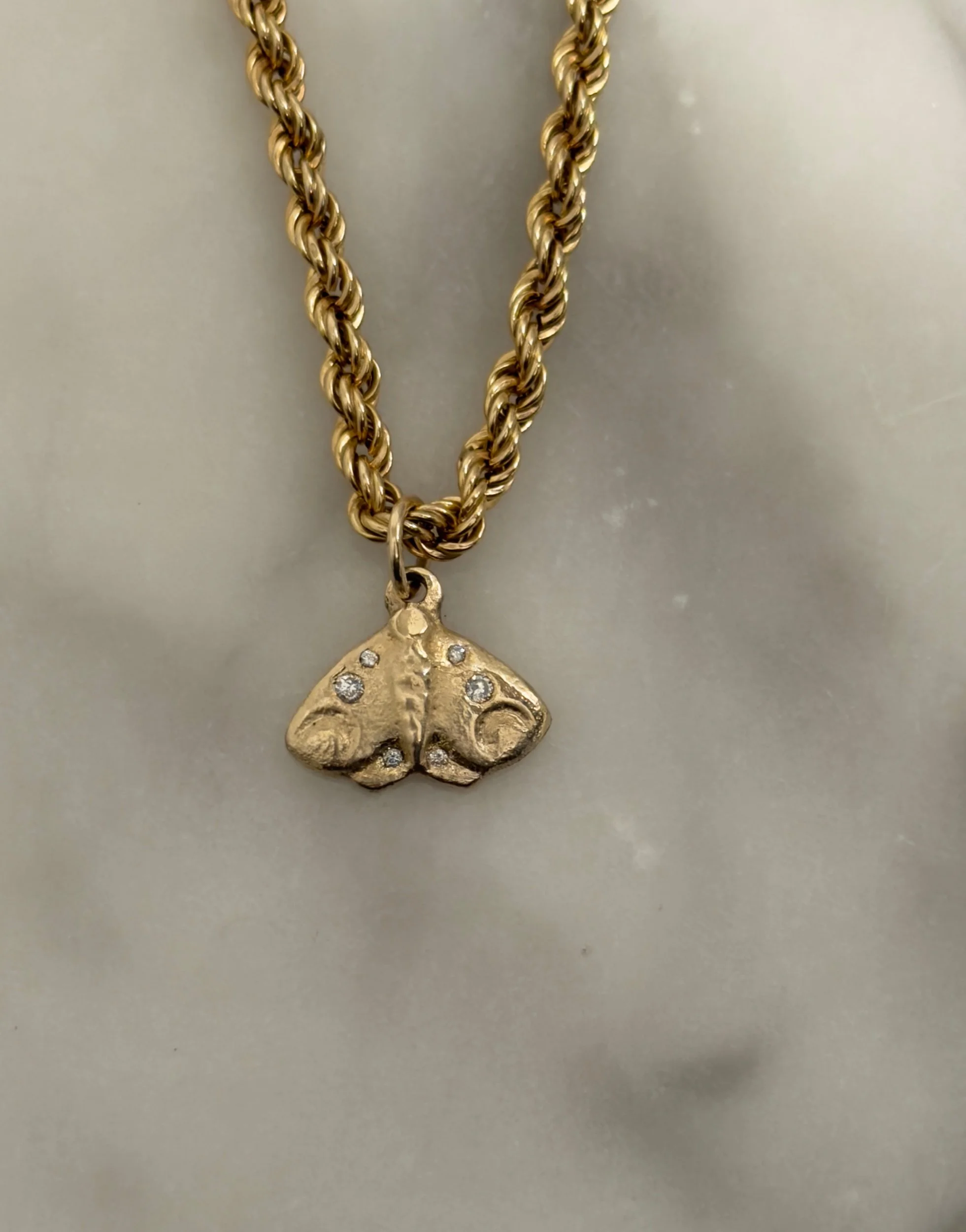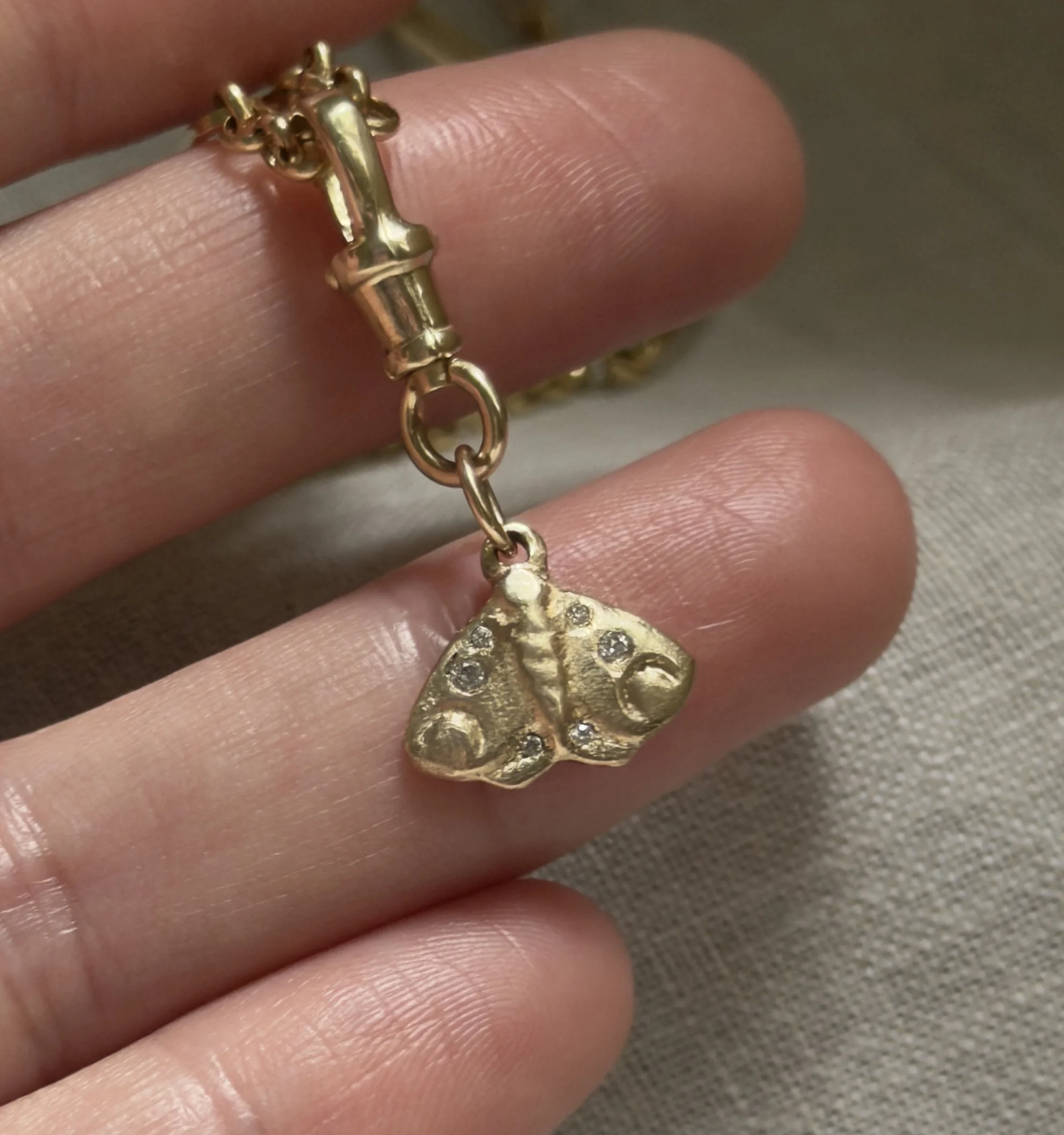 An ode to the Luna moth, drifting under glowing moonlight. This charm is sandcasted and handmade in-house with solid 10k yellow gold and diamonds. Full of organic texture and woodland magic. Ships within two business days.