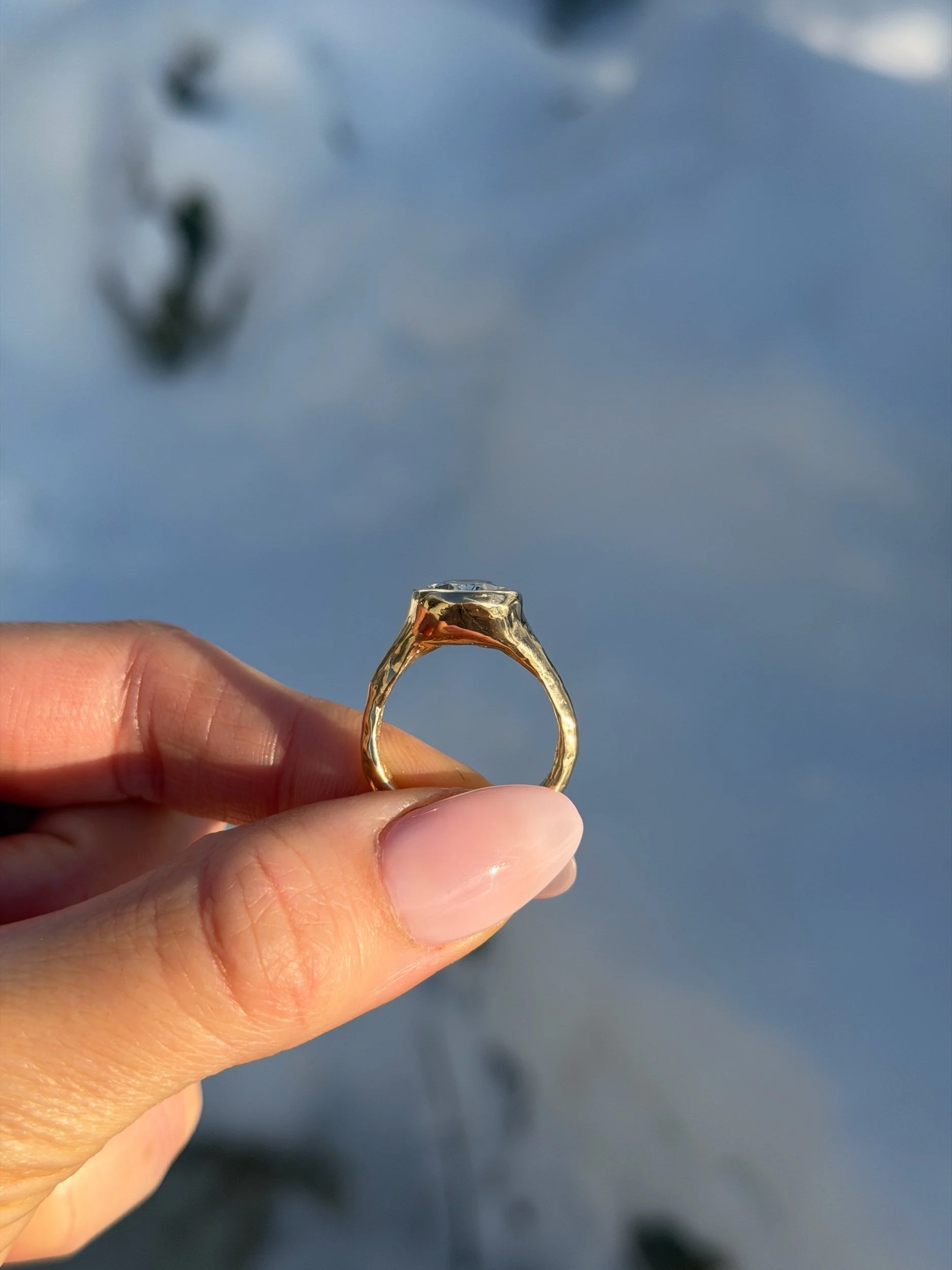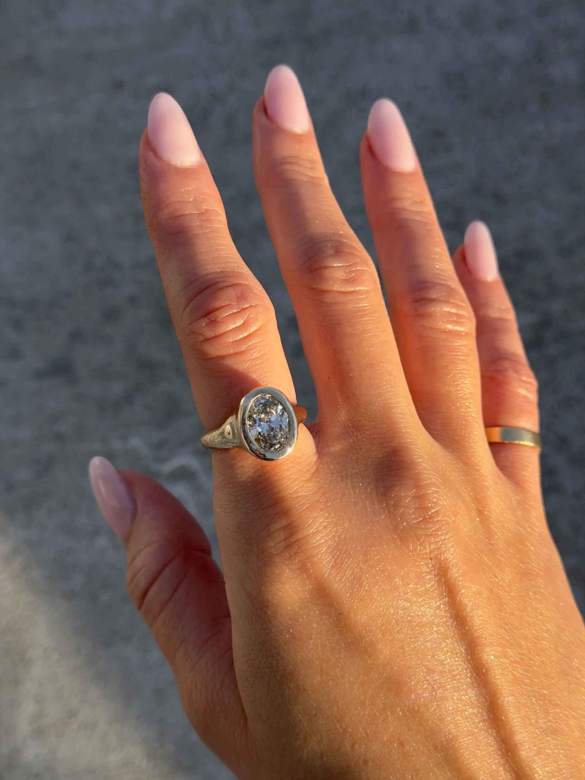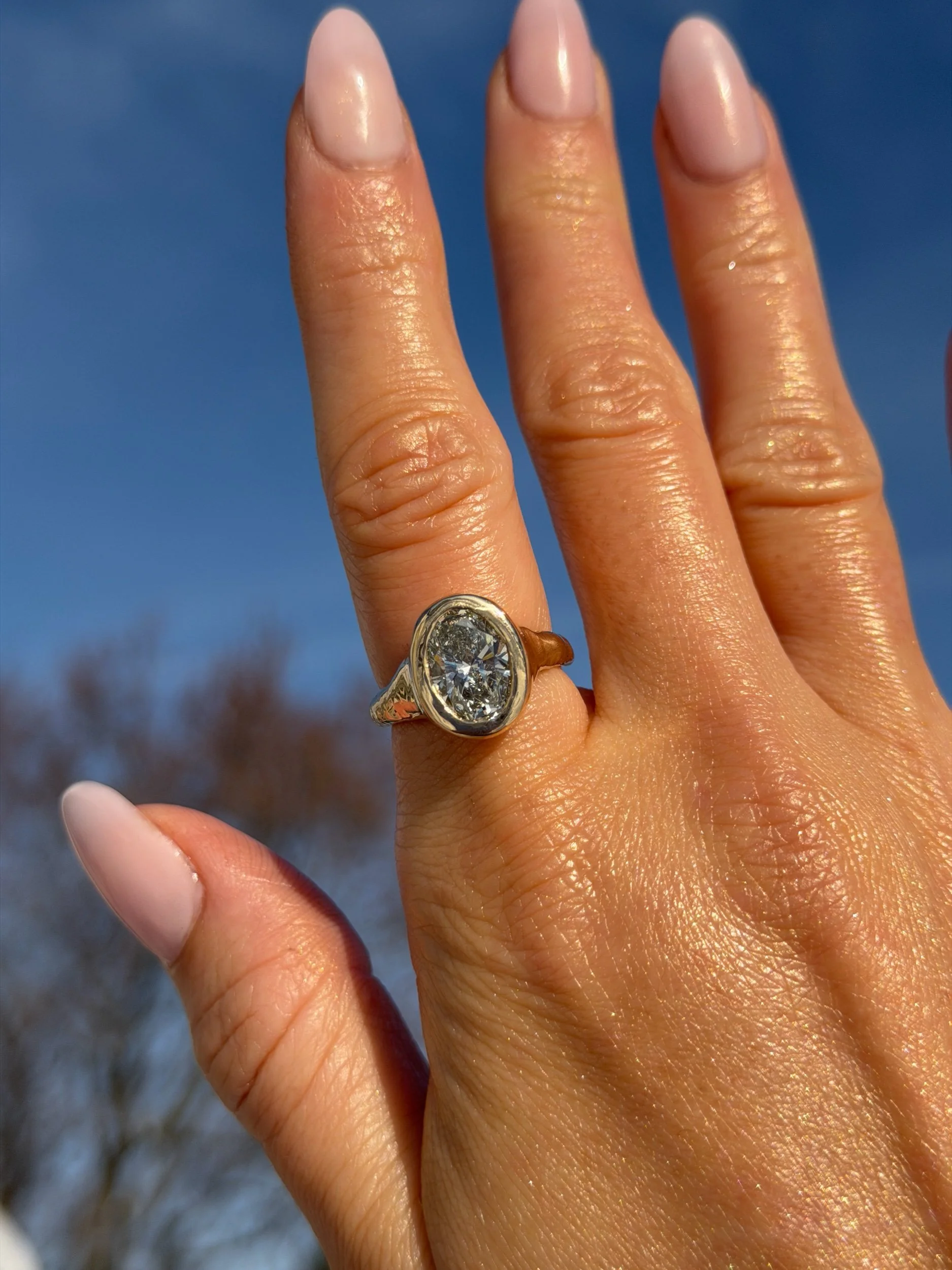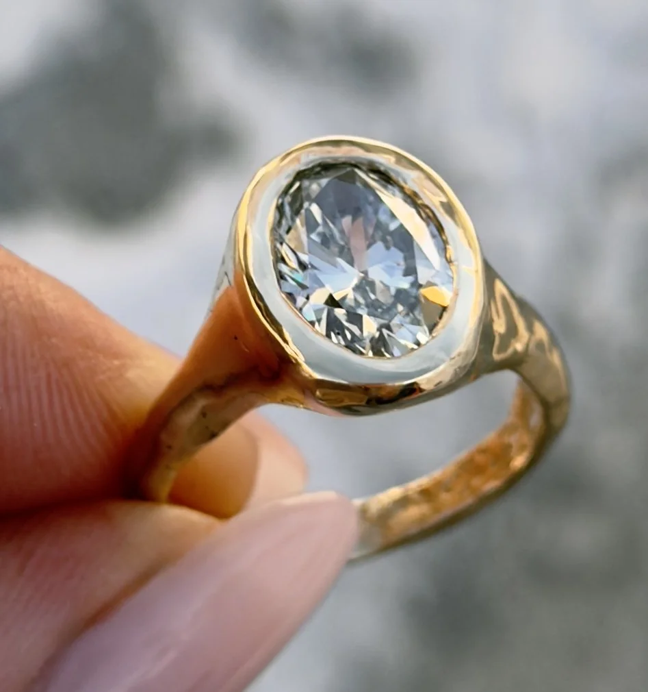 14k solid yellow gold wrapped around a lab oval diamond. Sandcasted and handmade in-house. Ships within two business days.