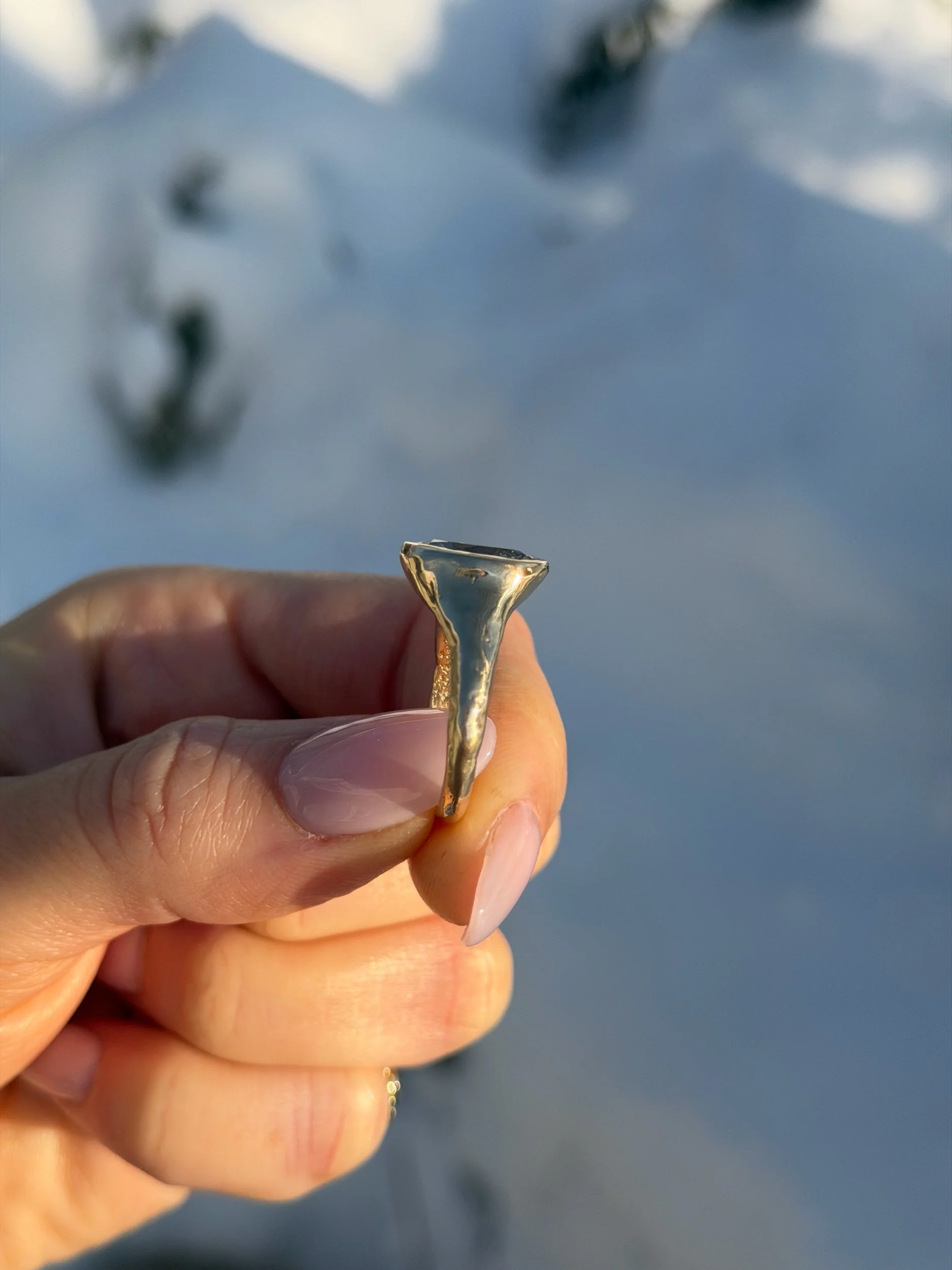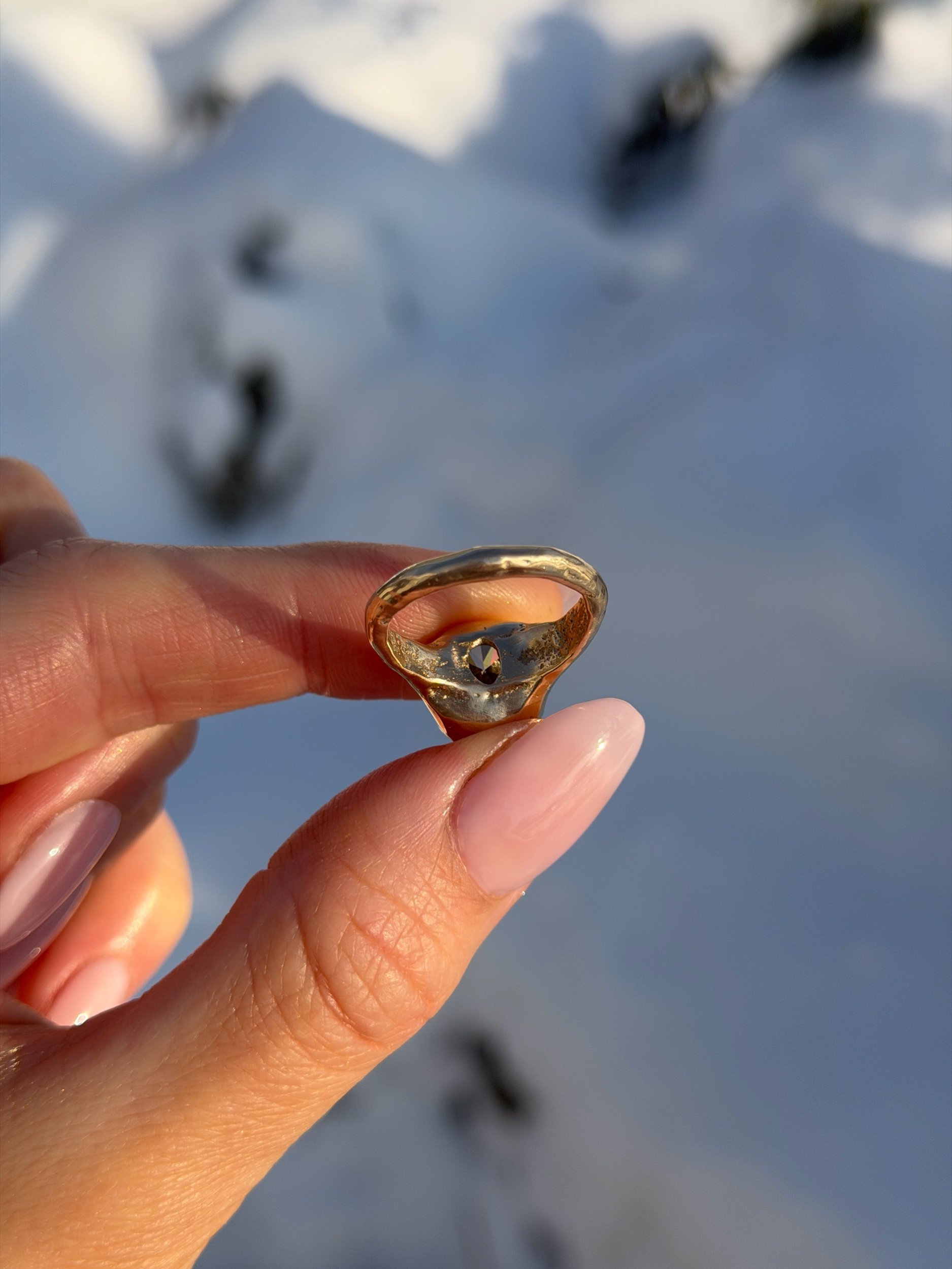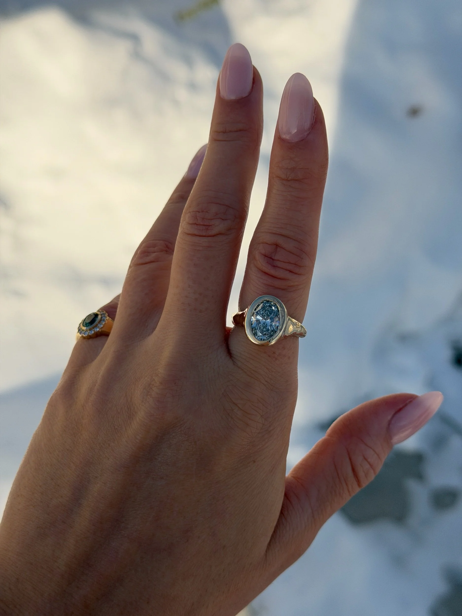 14k solid yellow gold wrapped around a lab oval diamond. Sandcasted and handmade in-house. Ships within two business days.